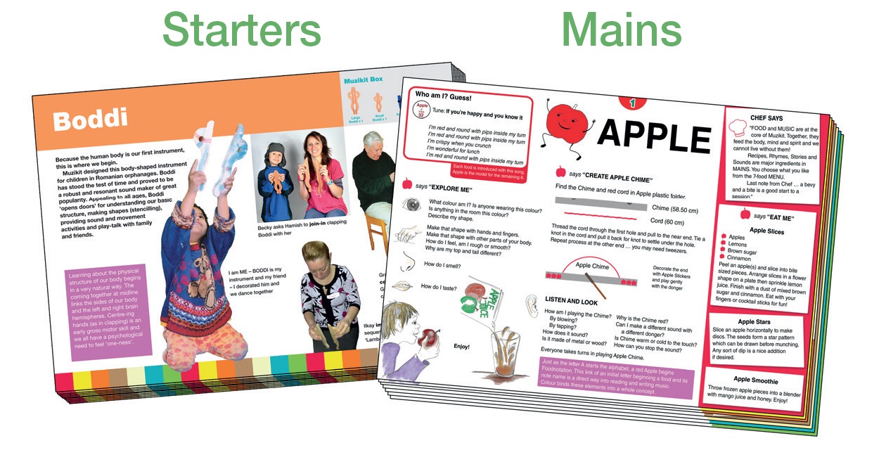 The Muzikit Handbook offers over 100 pages of art and craft ideas, games, songs, music scores, stories, and more. The Handbook has two parts, Starters and Mains.